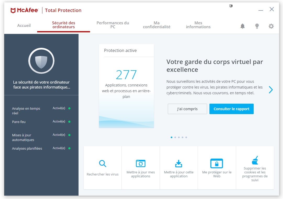 McAfee AntiVirus Plus 2019 - Télécharger pour PC Gratuitement 8/10 (409 votes) - Télécharger McAfee AntiVirus Gratuitement. McAfee AntiVirus est un des meilleurs logiciel antivirus pour protéger l'ordinateur Windows contre toute sorte de malware, virus, spyware et trojans. John McAfee, développeur de software, entrepreneur et politicien, est peut-être... Antivirus Gratuit 2022 - Télécharger Antivirus Gratuit - TotalAV Télécharger gratuitement le logiciel antivirus 2022 de TotalAV. Soyez 100 % immunisé contre les malwares et les virus grâce à la protection antivirus TotalAV Antivirus est un antivirus gratuit à utiliser avec toutes les fonctionnalités essentielles pour trouver et supprimer les logiciels malveillants... Télécharger Antivirus mcafee a vie gratuit - Lelogicielgratuit.com telecharger antivirus mcafee gratuit pour windows 8. mcafee antivirus vs total protection. telecharger mcafee antivirus plus 2014 gratuit. mcafee est il un bon antivirus. Télécharger McAfee Total Protection - 01net.com - Telecharger.com McAfee Total Protection regroupe tous les outils de sécurité et d'optimisation indispensables pour votre PC : anti-spam, anti-virus, anti-spyware, Firewall, Contrôle Parental, Sauvegarde, SiteAdvisor Plus, QuickClean and Shredder. Ces outils s'exécutent en arrière-plan, ce qui vous permet de profiter d'une...