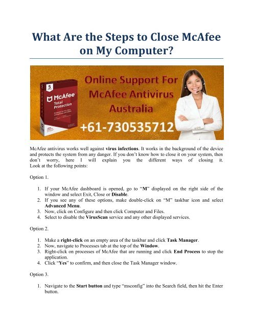 How to stop mcafee antivirus service. How to Disable or Enable McAfee Antivirus - YouTube Apr 25, 2018 ... In today's lesson, we will teach you how to Disable or Enable McAfee Antivirus.If you want to disable McAfee antivirus, go to the right ... Can not stop or delete McAfee core services Sep 12, 2020 ... We are sorry for the inconvenience. Please initiate MCPR Tool and while is being stuck at MFP, Please open Task Manager and end the McAfee ... How to stop and restart McAfee AntiVirus for Linux (TS101182) To stop AntiVirus for Linux · Click Applications. · Select Accessories. · Select Terminal. · Type the command below and press Enter: killall -9 netsafety ... [SOLVED] Stop mcafee services - Spiceworks Community Apr 20, 2010 ... My problem is that i need to stop all mcafee service. I need to deploy 3 files that the server needs i need to deploy the sitelist.xml, ...