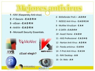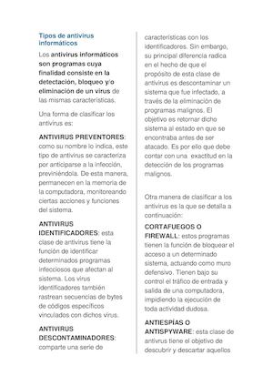 Tipos de antivirus informáticos. Tipos de antivirus informatico - Ejemplos Los antivirus son programas que fueron creados en la década de los 80's con el objetivo de detectar y eliminar virus informáticos. Actualmente, los antivirus reconocen diferentes tipos de virus como malware, spyware, gusanos, troyanos, rootkits, etc. Tipos de antivirus informáticos Eset Nod32 Antivirus: este software, diseñado por la compañía Eset, presenta una ventaja muy importante y es que cuenta con versiones para distintos sistemas operativos, entre otros, Linux, Windows, Mac OS X y Novell e incluso para los teléfonos móviles, cualidad que tienen sólo unos pocos. Resumen virus informatico - Resúmenes - 2022148015 Ensayos relacionados. Tipos De Virus Informáticos. Tipos de virus e imitaciones Existen diversos tipos de virus, varían según su función o la manera en que éste se ejecuta en nuestra computadora. 2 Páginas • 1447 Visualizaciones. Virus Informaticos Sus Efectos. 1.-Titulo del proyecto Efectos que provocan los virus informáticos en los equipos de cómputo 2.-Planteamiento del problema ... Los 10 mejores antivirus para tu computadora y celular Si Norton te defiende, estás seguro. Bitdefender: el mejor evaluado en el conteo de TopTen Reviews. De acuerdo con el sitio que pone a pruebas diferentes marcas, Bitdefender es el que mejor desempeño muestra al bloquear malware y el que ubica amenazas de forma más oportuna desde los buscadores.