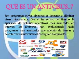 Antivirus Informático - Concepto, tipos y usos Puede identificarse varios tipos de antivirus informático, de acuerdo a su funcionamiento: Antivirus de identificación. Aquellos que rastrean secuencias activas asociadas a determinados virus, pero no son muy efectivos a la hora de lidiar con el software indeseado. Tienen la virtud de ser muy ligeros, algunos se ejecutan desde la red.