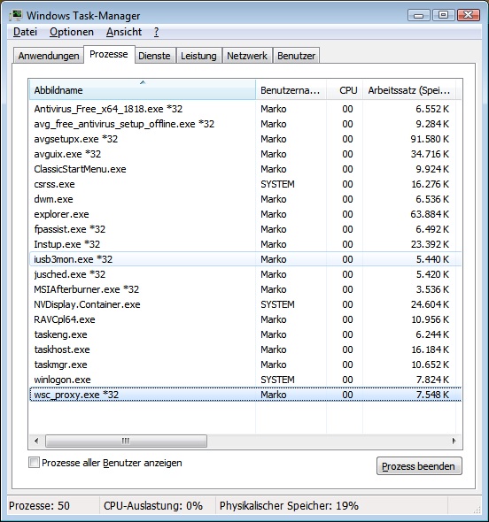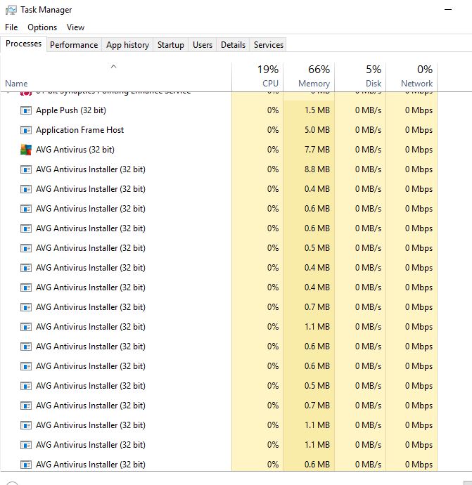 Can't end multiple "AVG Antivirus installer" processes | AVG If I look in Task Manager, I have 20 different "AVG Antivirus Installer (32 bit)" processes running. I can't use the "end task" on them. No CPU is being used by them. About 1MB of memory is being used by each. I updated my AVG software today, so there is one process which is using 8.8MB of memory.